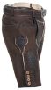 Die kurze Lederne hat einen geknöpften Schrittlatz, wird mit Gürtel plus Schnalle geliefert, hat zwei Einschubtaschen vorne, eine Messertasche seitlich, sowie eine offene Gesäßtasche. Zu einem echten Unikat wird diese Lederhose durch die aufwendige Plattstickerei und den echten Holzknöpfen.