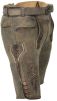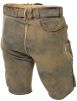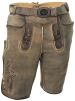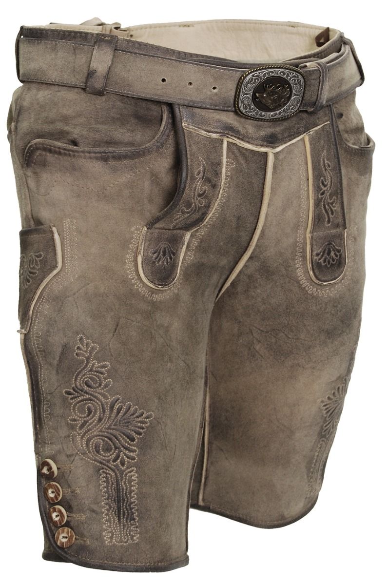 Die kurze Trachtenlederhose hat einen geknöpften Schrittlatz, wurde mit einem edlen, beigen Stick versehen, hat einen Gürtel mit Gürtelschnalle, zwei Einschubtaschen vorne, eine Messertasche seitlich und eine offene Gesäßtasche rechts. Der Hosenbund bei dieser Lederhose ist durch eine Lederschnürung hinten verstellbar.