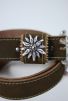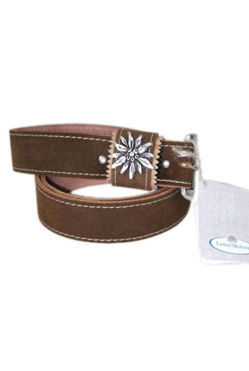 Rinderspaltleder Gürtel braun. Der Ledergürtel hat eine Breite von 3,4cm und fünf Löcher zur Weitenregulierung. Edelweiß Kopf und Nieten echt versilbert.