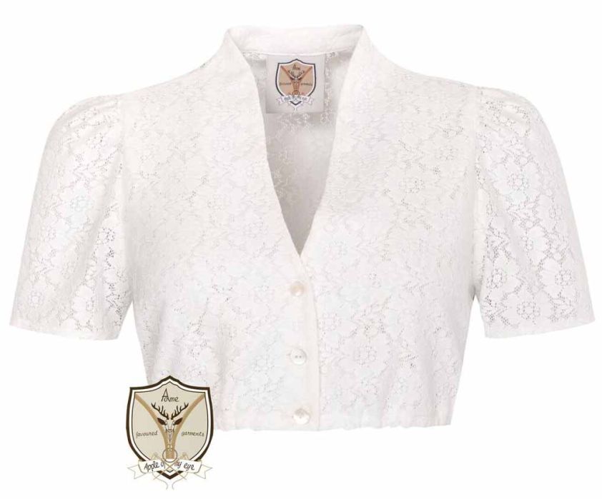 Außergewöhnliche off white Spitzen-Dirndlbluse zum knöpfen mit Stretchfaser. Ausgestattet mit drei echten Perlmuttknöpfchen und V-Ausschnitt.